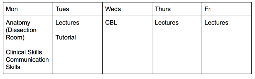 O: In preclinical years, you normally have 9-5 lectures 2x/ week, dissection room and clinical +/- comms skills on one day a week and CBL and lectures on one day.